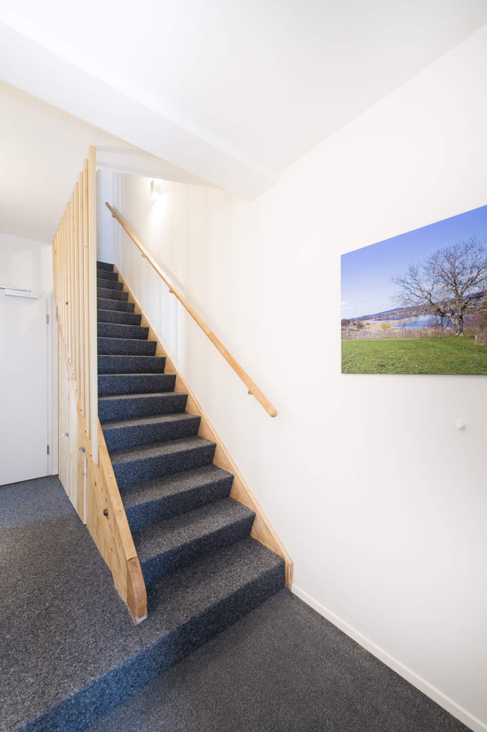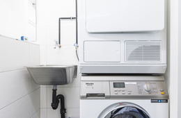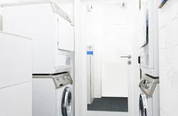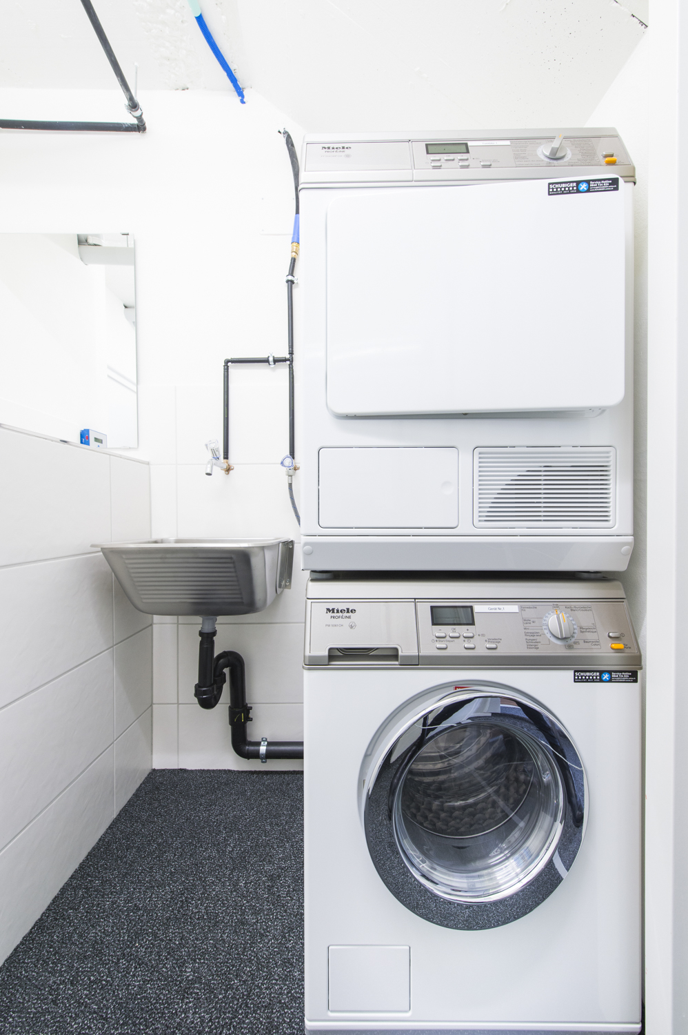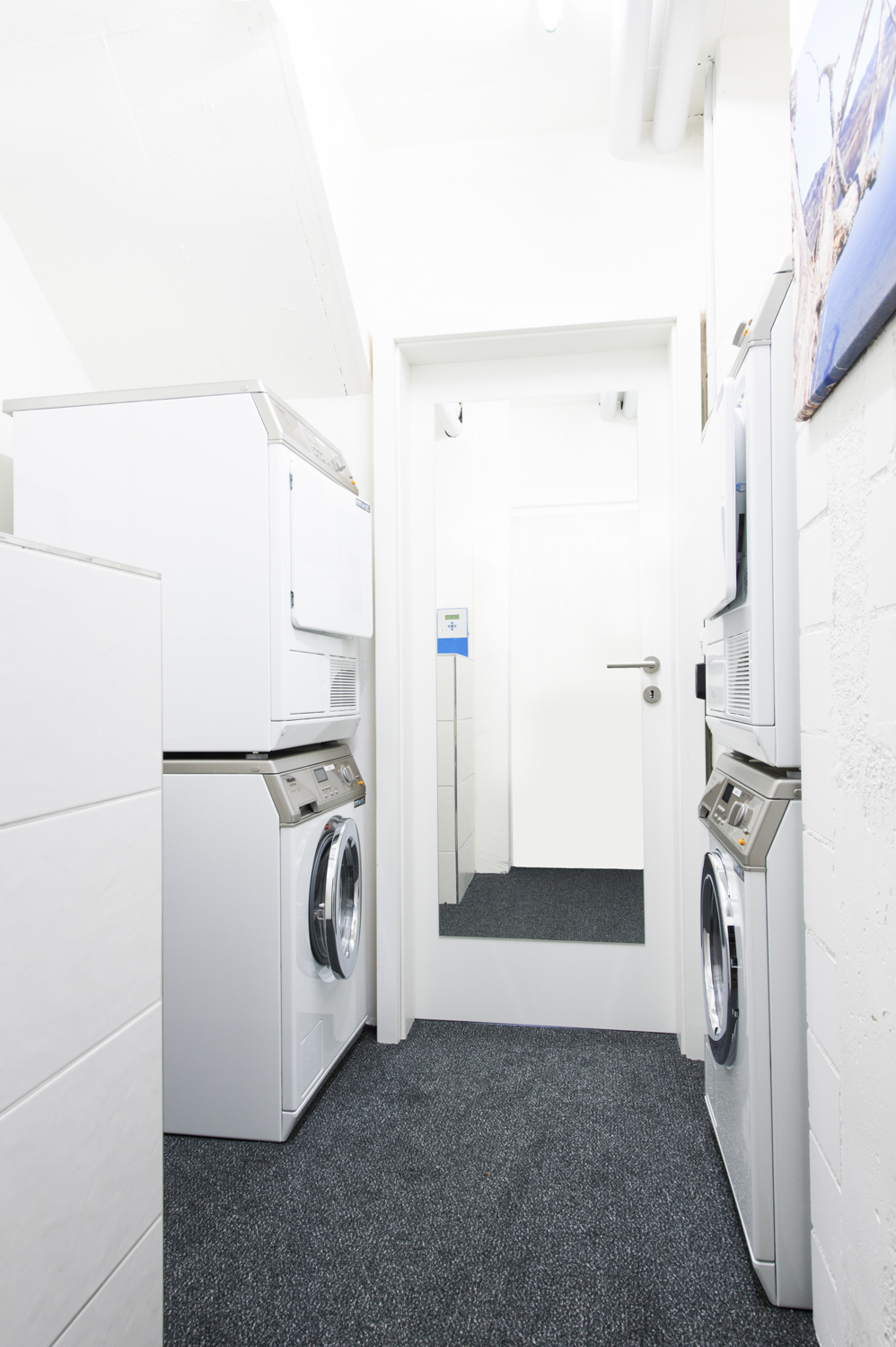 Die gemeinsame Waschküche verfügt über zwei moderne und effiziente Waschmaschinen und Tumbler. Die Benutzung kann reserviert werden oder spontan erfolgen. In jedem Zimmer sind zudem Bügelbrett und Bügeleisen vorhanden.