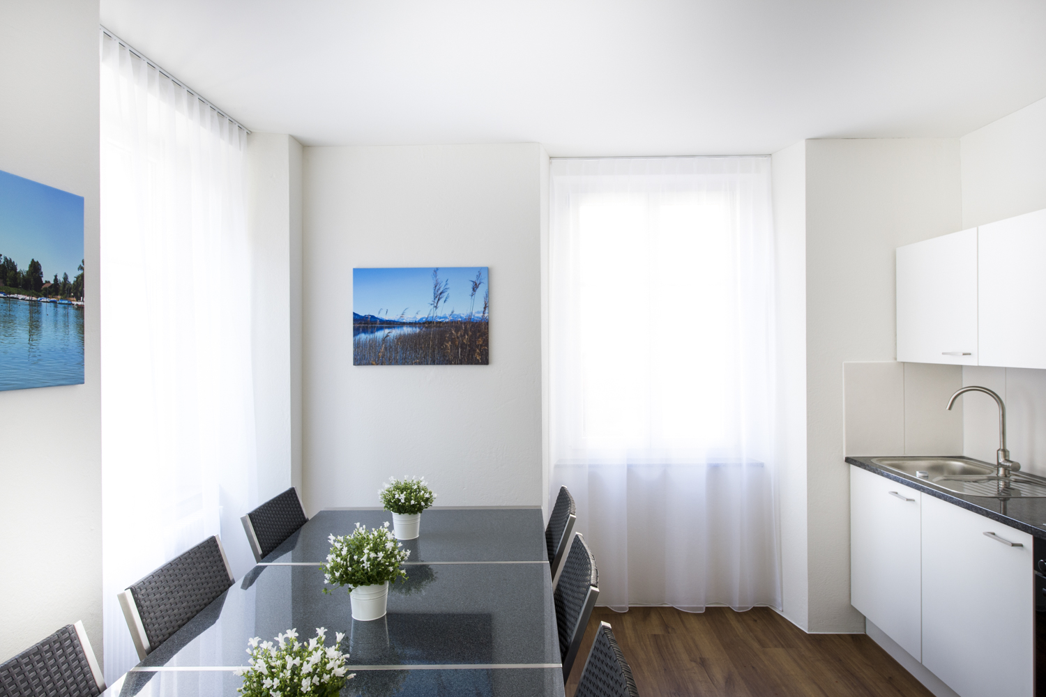 In der hellen und gut ausgestatteten Wohnküche kann man komfortabel kochen. Nach dem Kochen wird das Essen am grossen Esstisch genossen oder ins eigene Zimmer genommen.